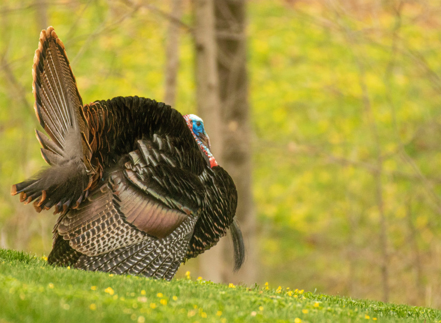 Wild turkey gobbler strutting in front of forsythia bushes early this spring.