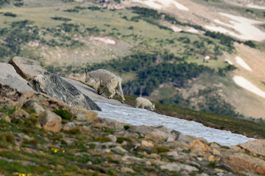 Mountain goat Nanny and Kid overlook a valley deep in the Beartooth Mountains of Montana